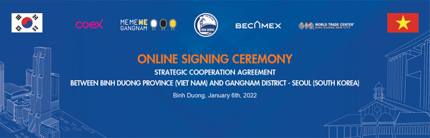 On January 6, 2022, the People’s Committee of Binh Duong Province, Vietnam and Gangnam-gu District, Seoul, Repulic of Korea, held an online MOU signing ceremony for “Strategic Cooperation Agreement to promote international trade activities and cultural exchange” . The MOU signing ceremony was witnessed by of leaders from Binh Duong Province and Gangnam-gu and held simultaneously in both countries online. At Binh Duong bridge point, there were participations of Mr. Nguyen Van Loi, Member of the CPV Central Committee, Secretary of Binh Duong Provincial Party Committee, Head of the provincial National Assembly Delegation, Mr. Vo Van Minh, Chairman of Binh Duong People’s Committee, Mr. Mai Hung Dung Standing Vice Chairman of Binh Duong People’s Committee, Mr. Wee Joon Soek, Deputy Consul General of Korea in Ho Chi Minh City, Mr. Pham Ngoc Thuan CEO Of Becamex IDC, Mr. Kim Won Sik – Chairman of Binh Duong Kocham, Mr. Park Jin Ku – Honorary Chairman of Binh Duong Kocham, Mr. Lee Dong Won – Chief Ref of KITA Vietnam, Mr. Kim Kwan Mook – Chief Ref of KOTRA Vietnam and other leaders of departments and companies in Binh Duong. At Gangnam brigde point, there were participations of HE. Soon Kyun Jung – Mayor of Gangnam, Ambassador of Vietnam to Korea HE. Nguyen Vu Tung, Mr. Lee Dong-won CEO of COEX, Mr. Kim Hi Joo, Director of New Design Bureau and Mr. Kang Ho Dong Head of Becamex IDC Office in Korea.