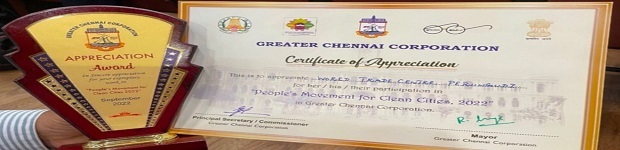 WTC Chennai wins the Award for Excellence in Waste Management by the Government of Tamil Nadu. Mr. Nagaraj, Head of Facility received the award from the Department.