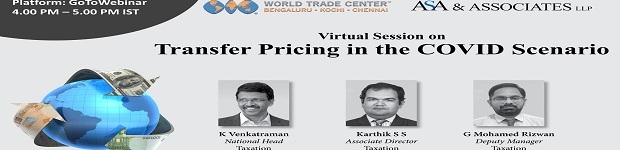 WTC Chennai organized a virtual session on âTransfer Pricingâ which discussed the impact of current economic situation on the existing cross border arrangements from an Indian and International Tax Regulation perspective. Mr. K. Venkatraman, National Head; Mr. Karthik, Associate Director and Mr. G. Mohammed Rizwan, Deputy Manager, Taxation from ASA & Associates LLP spoke.