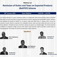 Mr. Ravi Raghavan in his introductory address gave an overview of the scheme. The scheme at its early stage still poses various challenges to exporters. Mr. Prabhakaran gave a background of the scheme and how it came to being. The reason for introduction of the RoDTEP scheme was to overcome the legal challenges faced by India at WTO as the MEIS scheme was challenged by USA and other countries for being inconsistent with Article 3.1(a) of the Agreement on Subsidies and Countervailing Measures (SCM). Some of the existing schemes like export oriented units/EHTP/BTP, Export Promotion Capital Goods Scheme were challenged as there were several claims by United States against several subsidies that were provided to the exporters which had put some of the US importers at a disadvantage. The MEIS Scheme has been discontinued with effect from 31st December 2020 and RoDTEP commenced on 1st January 2021.