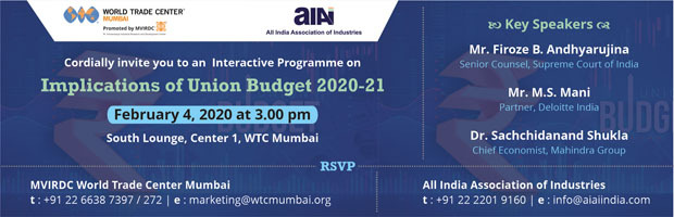 MVIRDC World Trade Center Mumbai and All India Association of Industries are jointly organsiing an interactive programme on 'Implications of Union Budget 2020 - 21at World Trade Center Mumbai on February 4, 2020 at 3 pm. the speakers at the event are Mr. Firoze B. Andhyarujina, Senior Counsel, Supreme Court of India, Mr. M. S. Mani, Partner - GST, Deloitte India and Dr. Sachchidanand Shukla, Chief Economist, Mahindra Group.Â