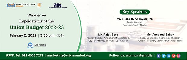 We are pleased to invite you for a webinar on ‘Implications of Union Budget 2022-23’ on Wednesday, February 2, 2022 at 3.30 pm. This event is organized by MVIRDC World Trade Center Mumbai and All India Association of Industries.Â