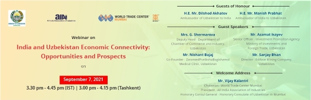 World Trade Center Mumbai in association with All India Association of Industries and the Embassy of Uzbekistan in New Delhi has organised a webinar on ‘India and Uzbekistan Economic Connectivity: Opportunities and Prospectus’
