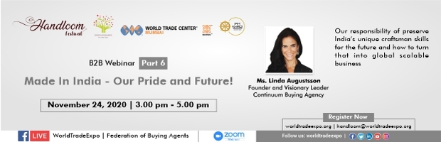 Our Distinguished speaker: Ms. Linda Augustsson, Founder and Visionary leader, Continuum Buying Agency, will address business owners and exporters from the handloom sector