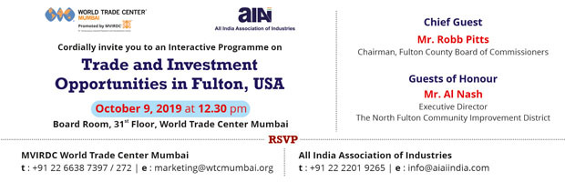 Mr. Robb Pitts, Chairman, Fulton County Board of Commissioners and Mr. Al Nash, Executive Director, The North Fulton Community Improvements District will participate in an interactive programme on Trade and Investment Opportunities in the county to be held at MVIRDC World Trade Center Mumbai. They will discuss the potential of the region and further help companies set up businesses in Fulton County.