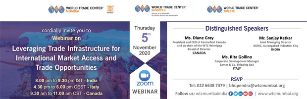 We are pleased to inform that World Trade Center Mumbai together with World Trade Center Winnipeg, Canada and World Trade Center Trieste, Italy is organizing the Part 2 webinar in the series of Virtual Trade Dialogue -'Leveraging Trade Infrastructure for International Market Access and Trade Opportunities'