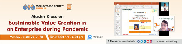 Ms. Chhaya Sehgal, Founder and CEO â The Winning Edge, conducted the Master Class on 'Sustainable Value Creation in an Enterprise during Pandemic' organised by MVIRDC World Trade Center Mumbai on June 29, 2020.