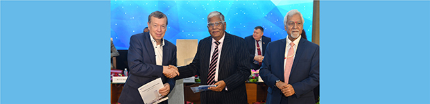 In Photo: Mr. Anatoly Goltsov, Chairman, Lipetsk Chamber of Commerce and Industry (left) exchanging MoU with Dr. Vijay Kalantri, Chairman, WTC Mumbai (middle). Also seen in the photograph is Capt. Somesh Batra, Vice Chairman, WTC Mumbai.
