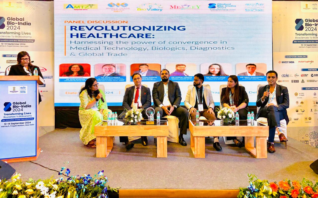 Global Bio India 2024 for invited our Executive Director, Niraj Khivansara for a panel discussion on Revolutionizing HealthCare at Pragati Maidan , Delhi. The discussion encompassed topics like Medical Technology, Biologics, Diagnostics and Global Trade. Niraj’s insights focused on how our World Trade Centre and its global network would play a vital role in innovation in the medical world with an aim to eradicate diseases. He enjoyed the exchanges with fellow panelists Rajiv Chibber -VP External Affairs at Sahajanand Medical Technologies Ltd & J. Coordinator, Govt & Public Affairs.AiMeD, Abhivan Thakur- Managing Director at Accurex Biomedical (P) Ltd., Dr. Suresh Thakur- President at Scientific Affairs Trivitron Healthcare (P) Ltd., Hemaal Dhar Global Product Manager at Genes - 2 me (P) Ltd. and Dr Ekta Khattar - CEO at Define Bio(P) Ltd. AMTZ as moderator.