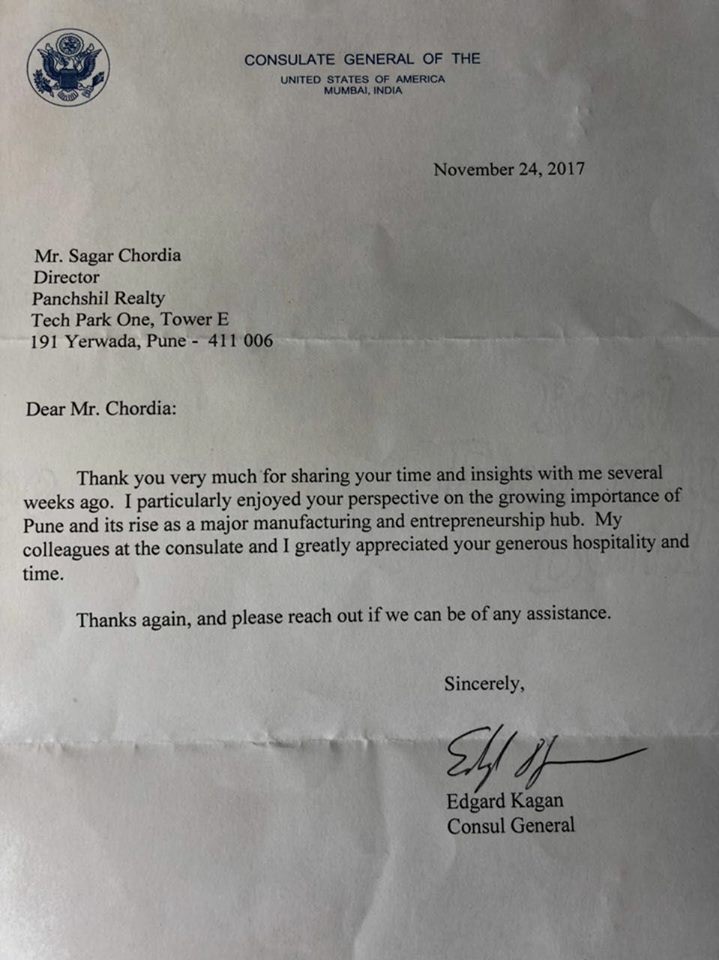 Mr. Sagar Chordia, Director – World Trade Center Pune welcomed Mr. Kagan and Team from US Consulate at Mumbai including Mr. Gregory Taevs, Principal Commercial Officer, Mr. Eric Levy and Mr. Chris Crossman.