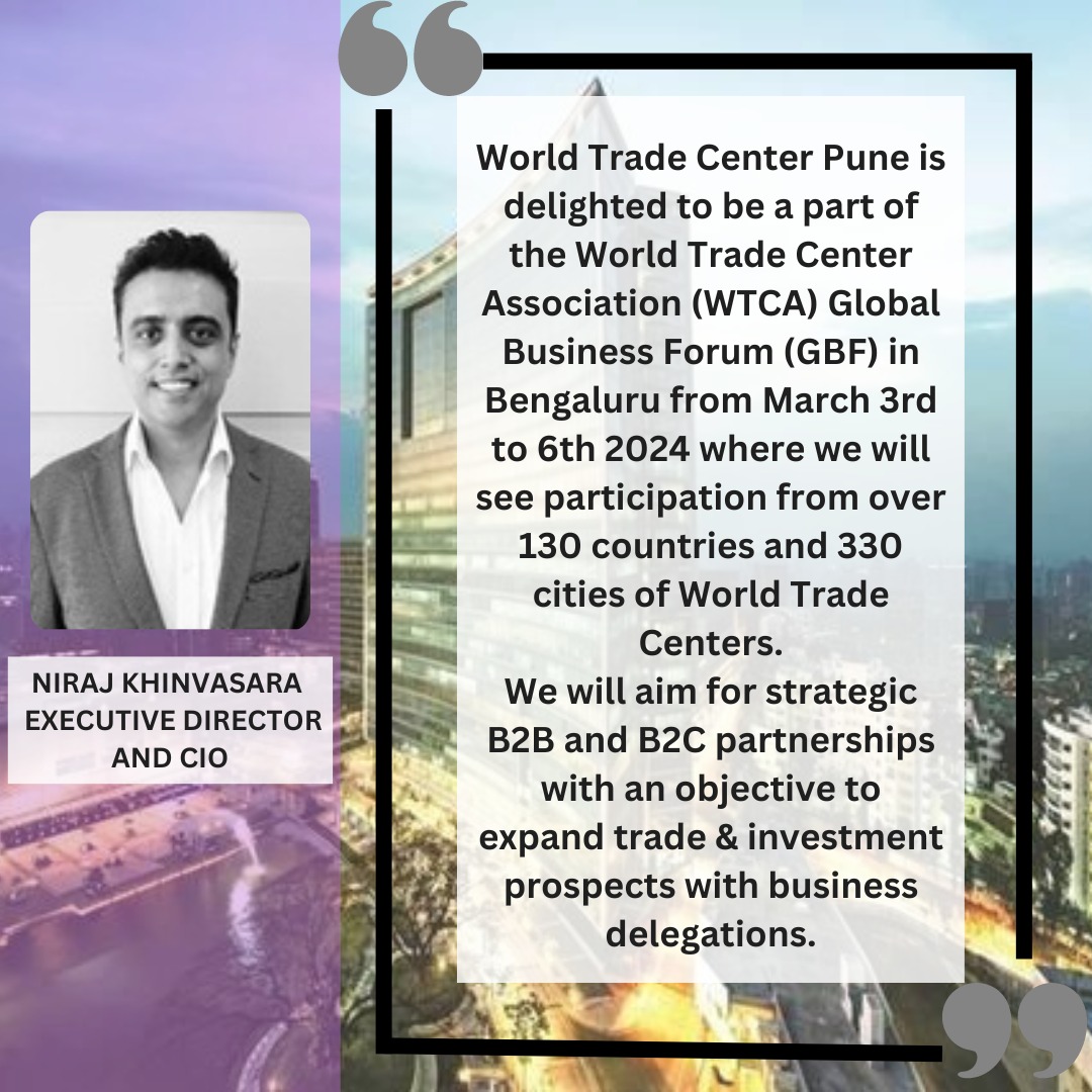 Niraj Khinvasara (World Trade Center Pune) shares:- “ World Trade Center Pune looks forward to the World Trade Center Association Global Business Forum in Bengaluru.