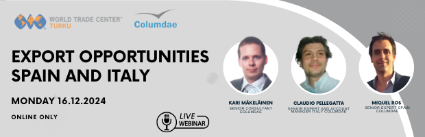 Join us for a quick webinar with laser focus on Spain and Italy. WTC Turku Partner Columdae, an export and business expansion expert, will be sharing insights on sectors, approach and business cultural issues in these countries.