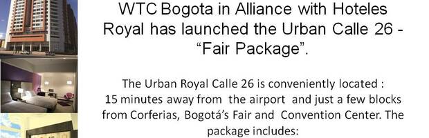 WTC Bogota in Alliance with Hoteles Royal has launched the Urban Calle 26 -“Fair Package”. The Urban Royal Calle 26 is conveniently located : 15 minutes away from the airport and just a few blocks from Corferias, Bogotá’s Fair and Convention Center. The package includes:AccommodationTransportation Hotel Urban 26-Corferias *Courtesy GiftEnd of Fair CocktailWTC Bogota – Advisory & Counseling : Additional Option B2B Matchmaking* Subject to schedule , Only for the days the fair is opened to the public