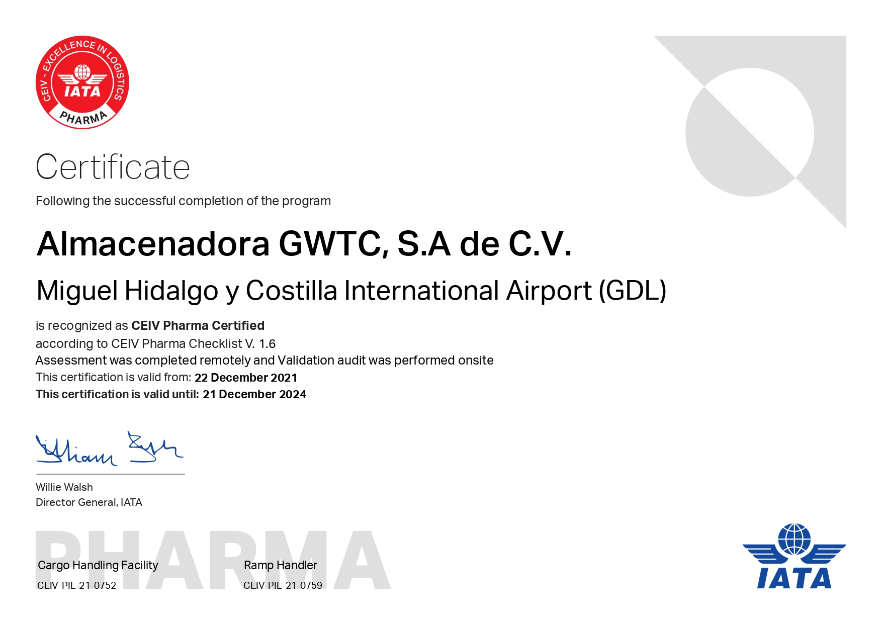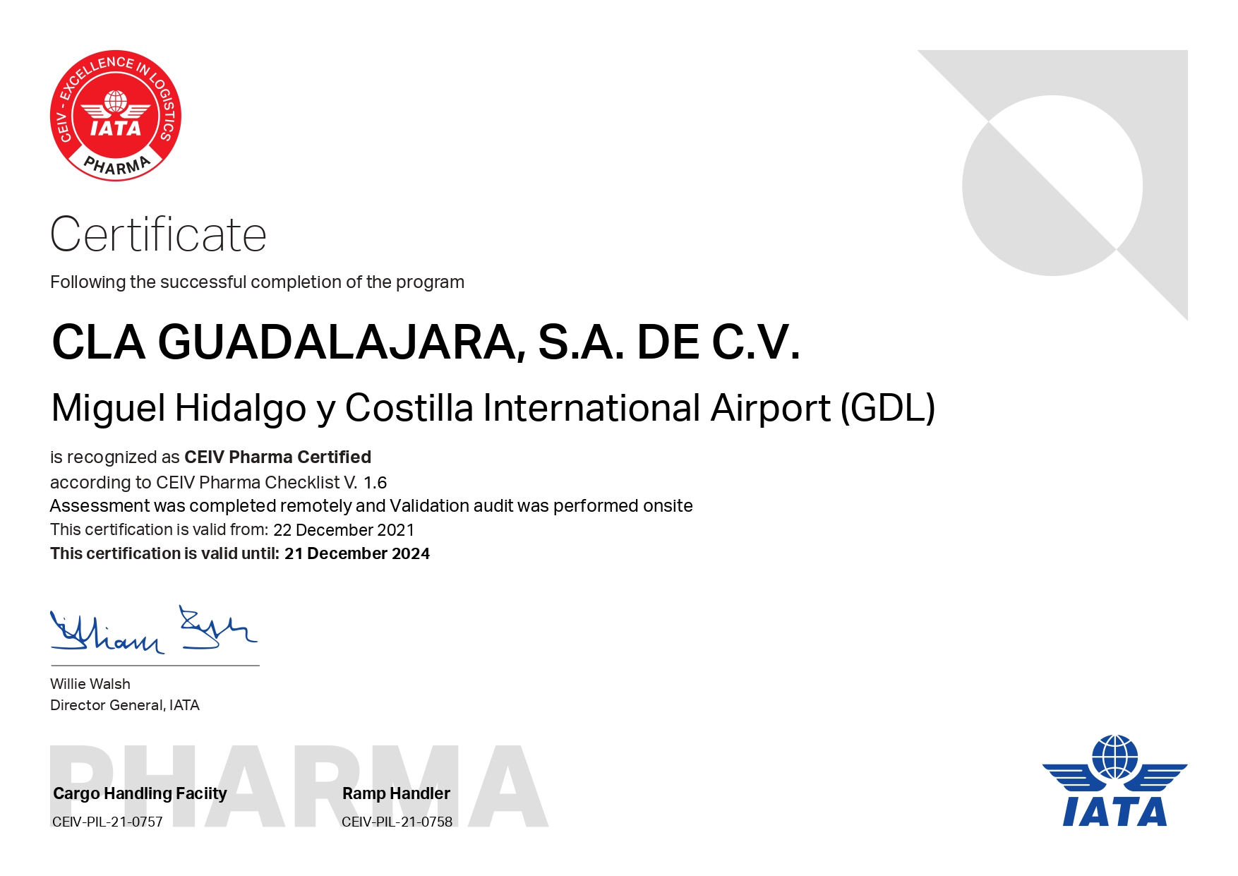 We are proud to announce that on December 22nd, 2021 we have successfully completed all the evaluations and audits and received IATA's CEIV PHARMA Certification for cargo/warehouse operations. This achievement confirms our high quality and standards regarding the handling and transport of pharmaceutical and perishable products.