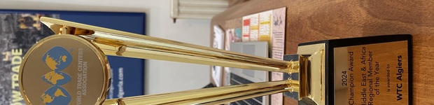 We are proud to receive from WTCA the trophy awarded to WTC Algiers , among 45 nominated WTC members as Regional Member of the year in Middle East and Africa .