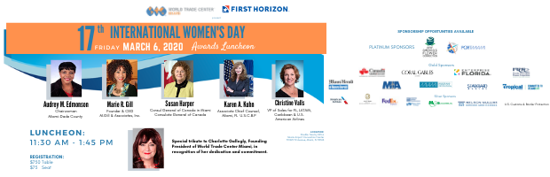 The 17th International Women's Day Awards Luncheon will take place on Friday, March 6, 2020, and will honor women who have made significant contributions in advancing international trade and business in Florida and Miami.