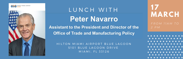 Join us for a special luncheon with Dr. Peter Navarro, Assistant to the President of the United States and Director of the Office of Trade and Manufacturing Policy. At the White House, Dr. Navarro is the Director of the Office of Trade and Manufacturing Policy (OTMP), an office established by President Trump to defend and serve American workers and domestic manufacturers. Â